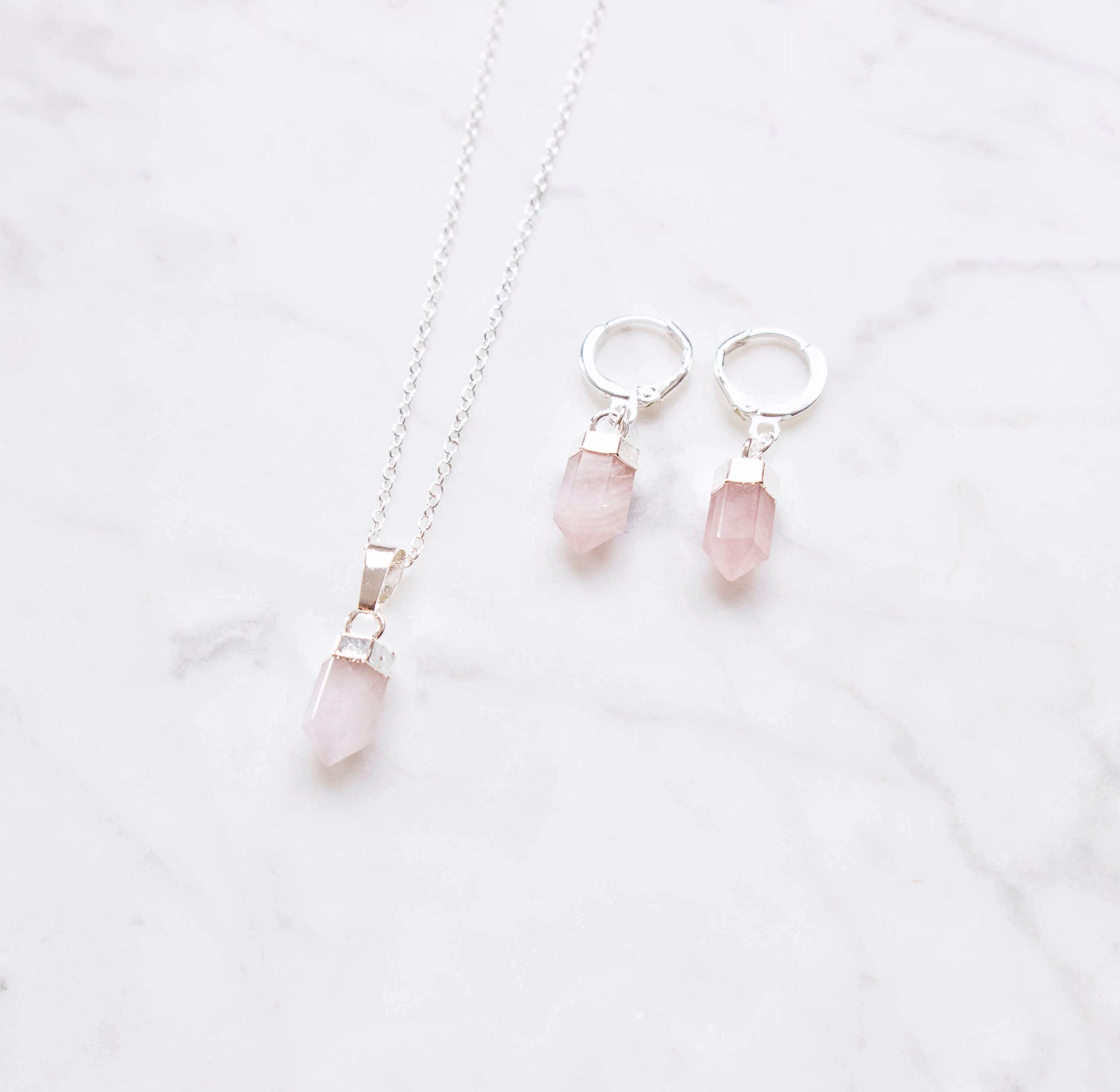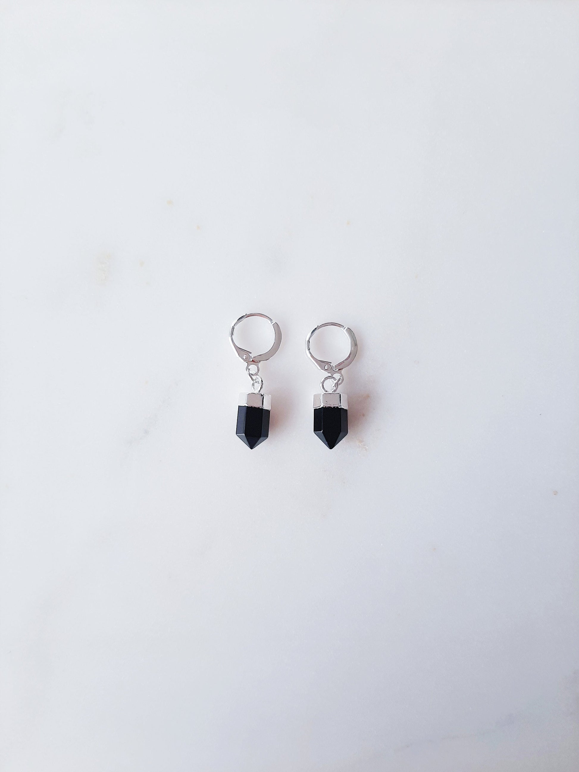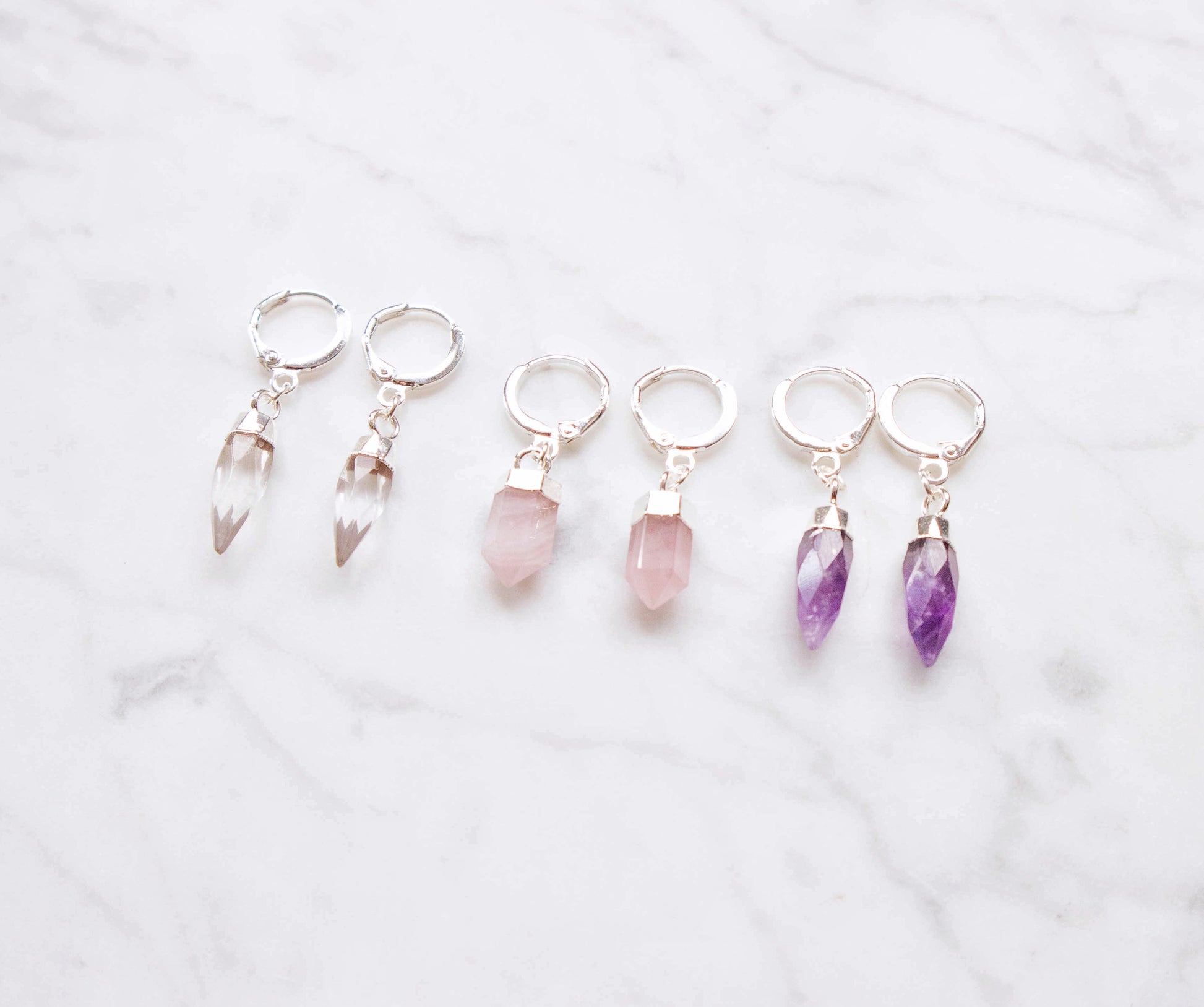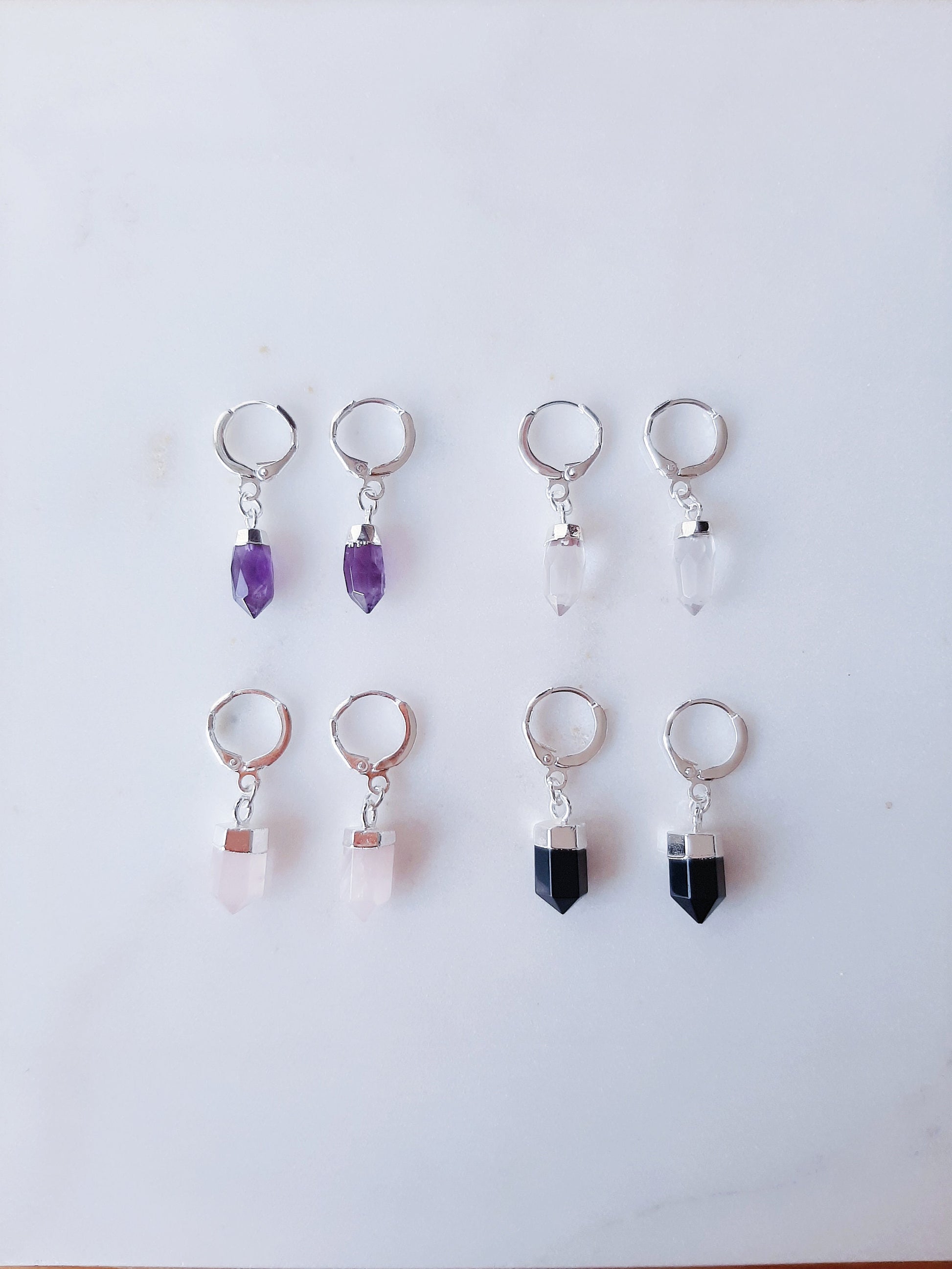 Ate is a pair of hoop earrings with amethyst, rose quartz, obsidian or clear quartz pendants. It's the ultimate pair to spruce up your outfit or to give as a gift to your gem of a friend!