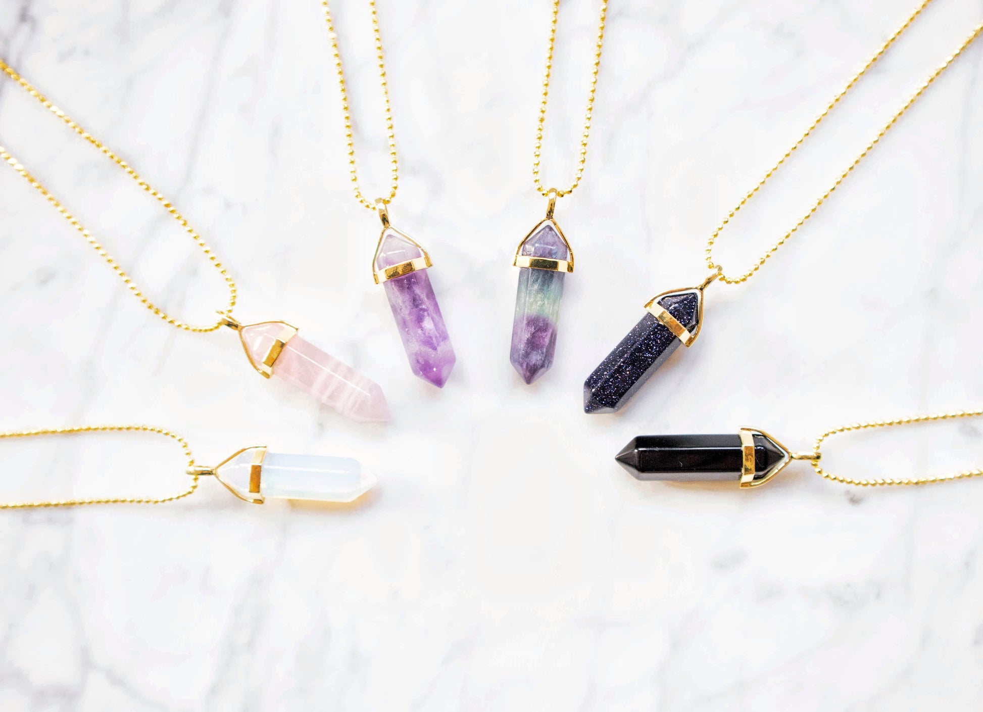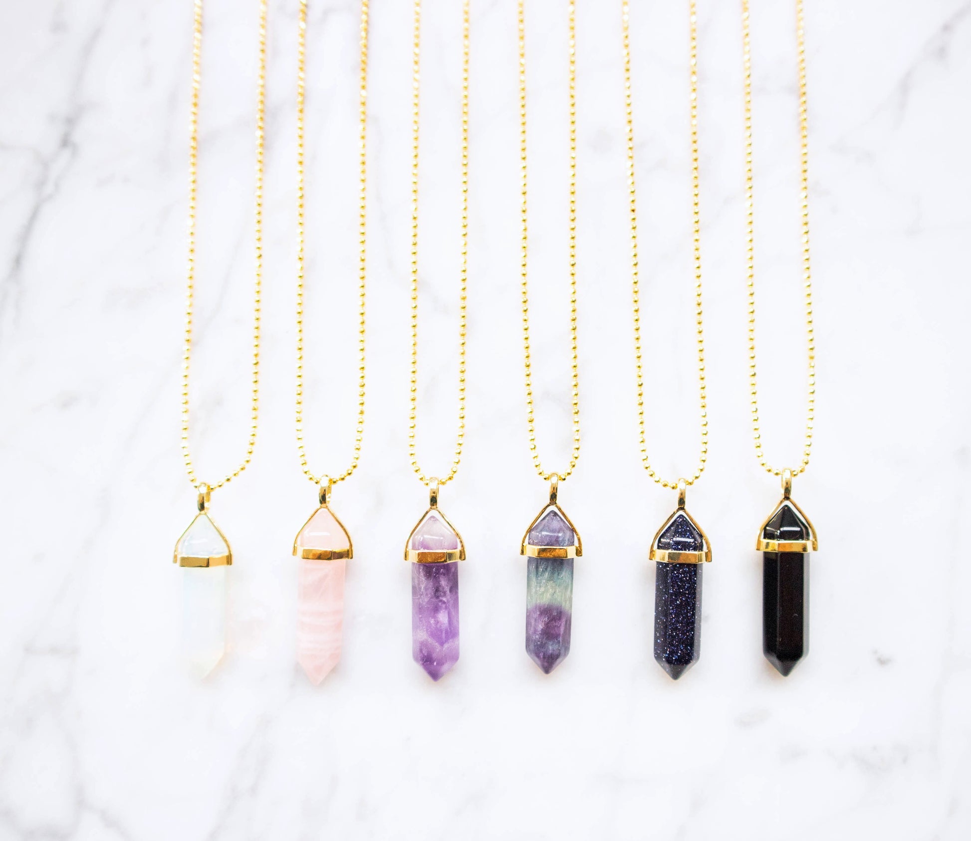 Our Bulletpoint necklaces all have a crystal pendant. It's the ultimate piece to spruce up your outfit or to give as a gift to your gem of a friend! Each necklace comes with their own card.