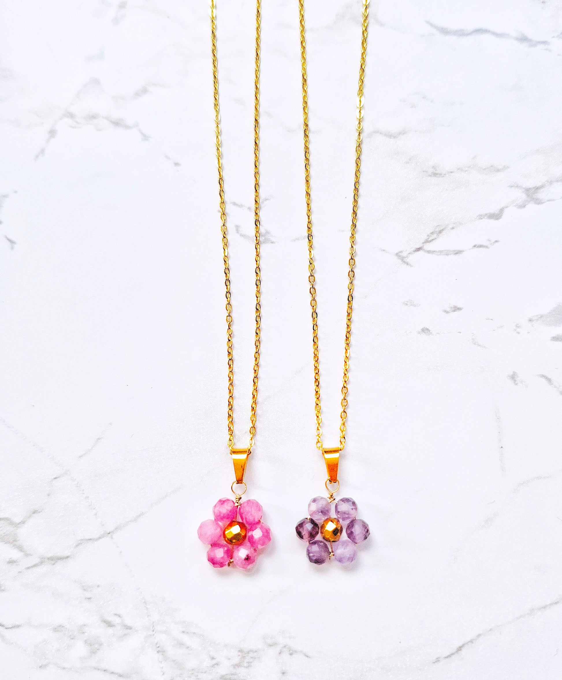 Get your hands on the Flower Girl pink Tourmaline necklace. These are made with pink Tourmaline beads, a pyrite bead and stainless steel materials. It's the ultimate piece to spruce up your outfit or to give as a gift to your gem of a friend!