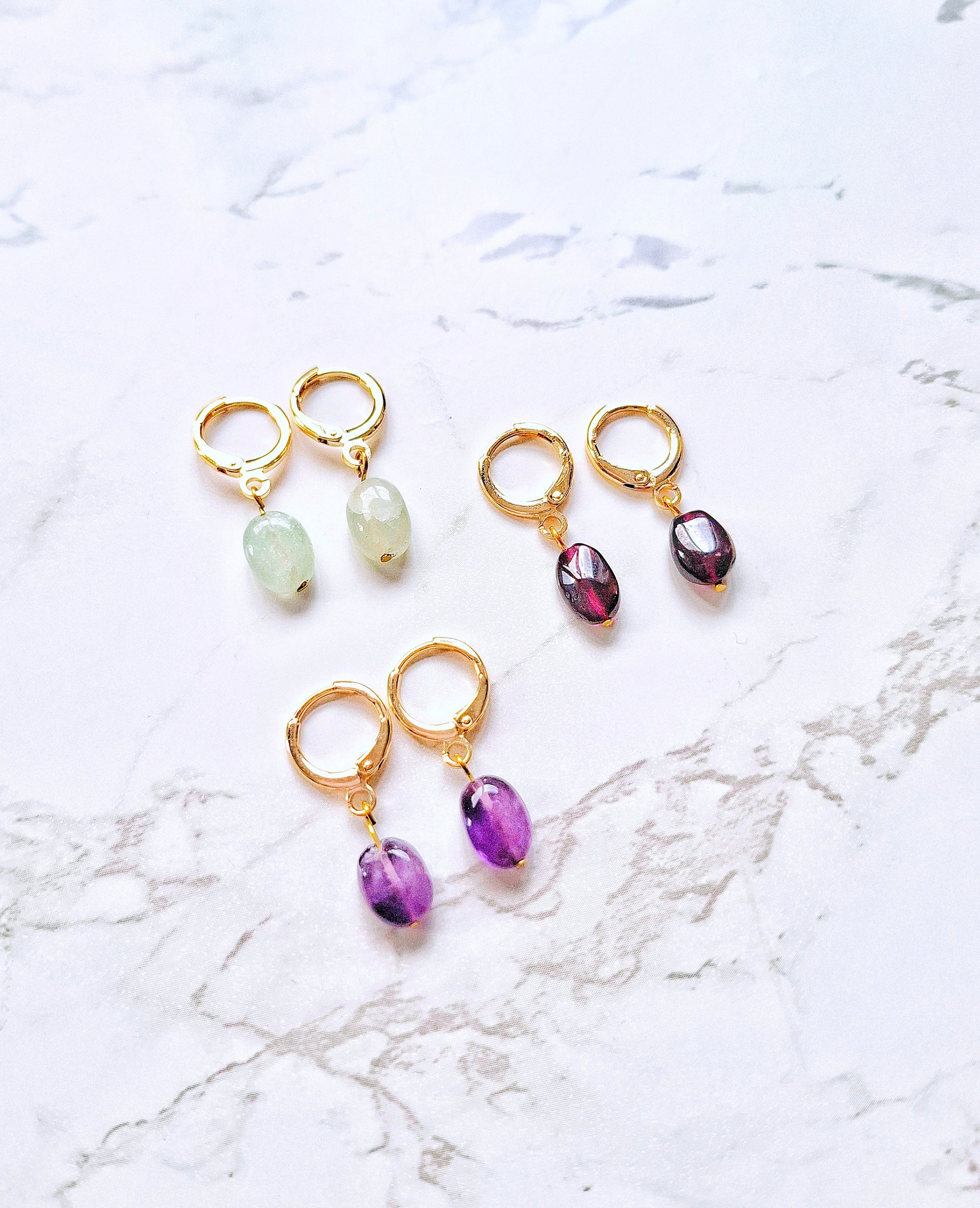 The nuggets earrings each have a small crystal pendant. They are available in three kinds: Amethyst, Garnet and Chrysoprase. It's the ultimate pair to spruce up your outfit or to give as a gift to your gem of a friend!