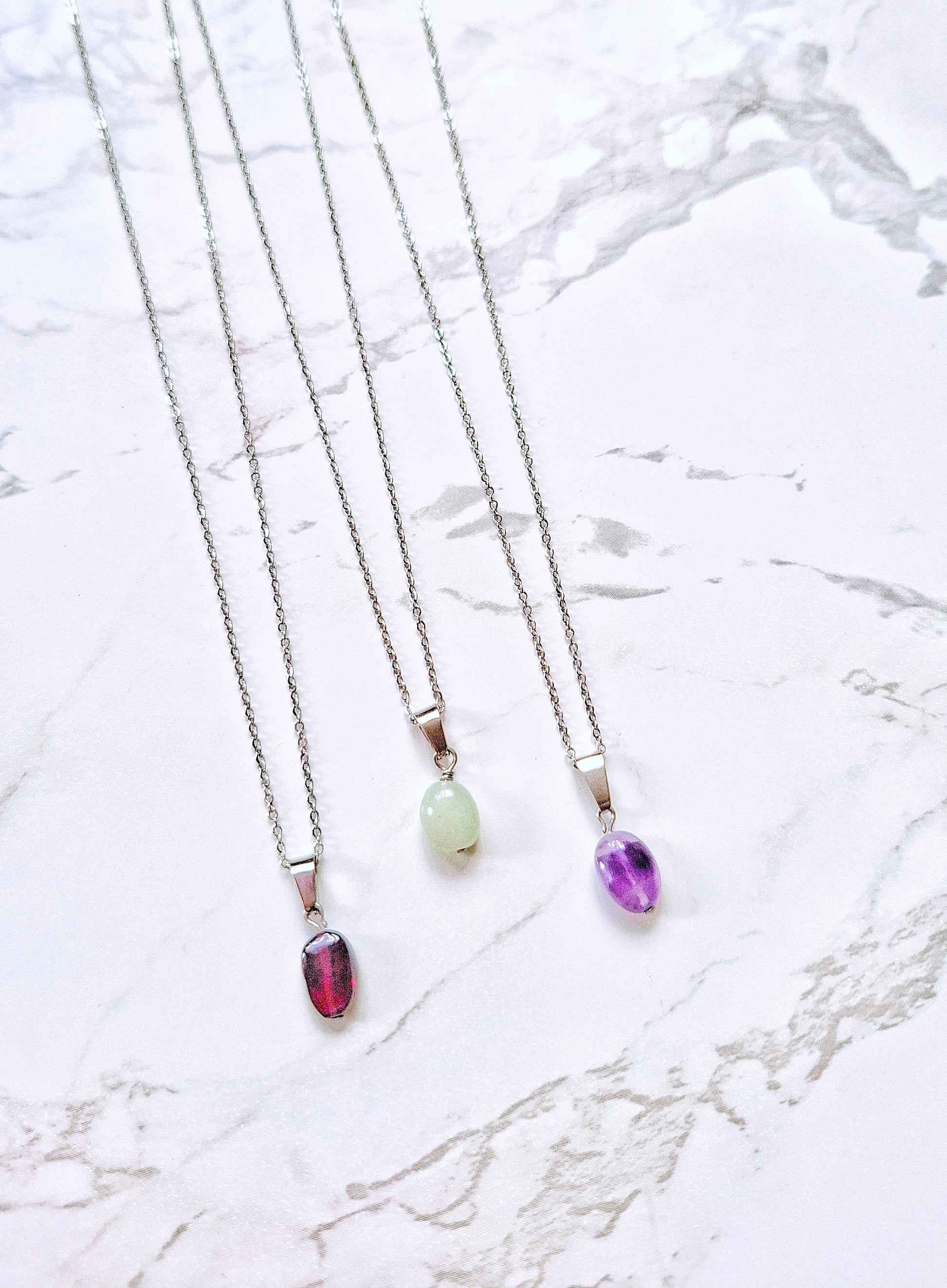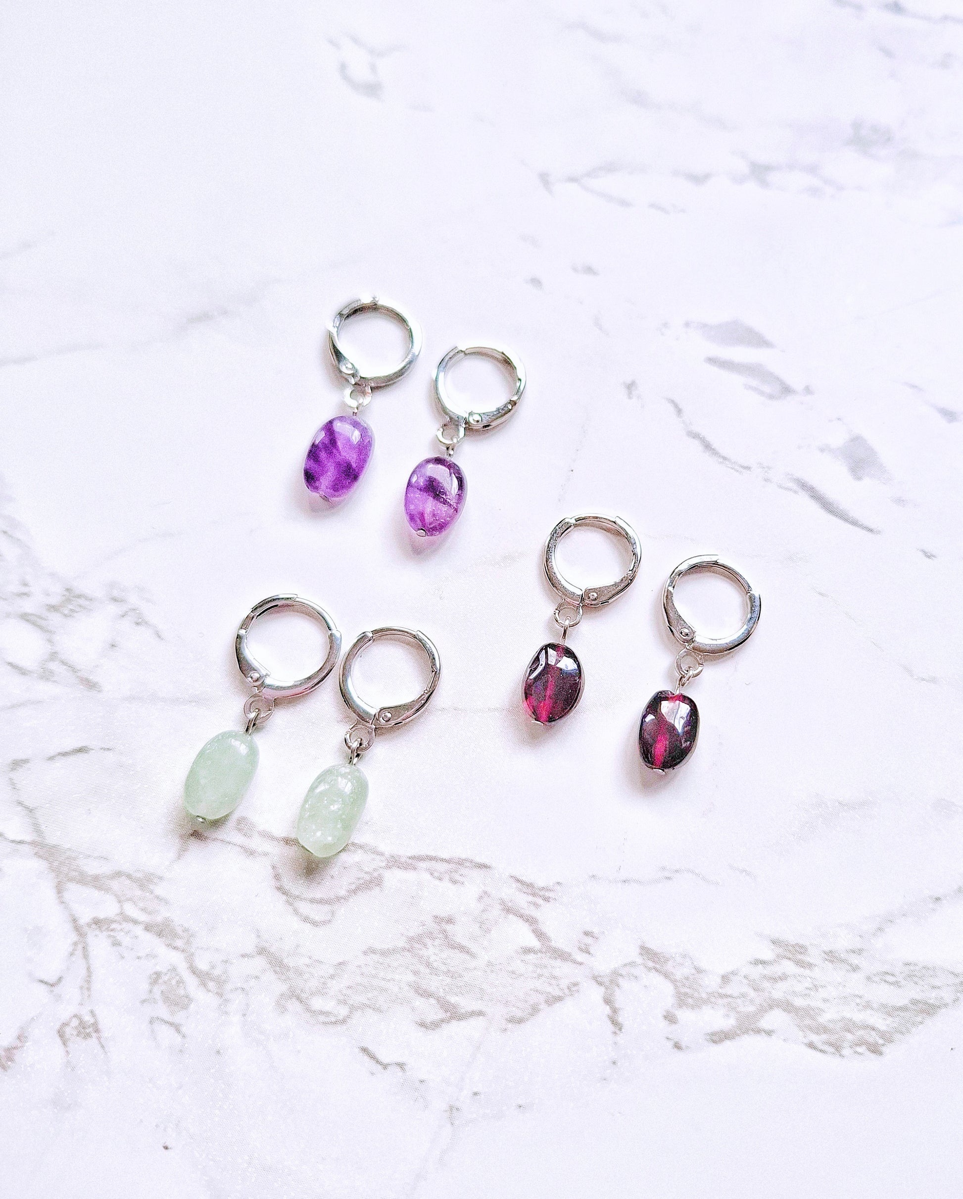 The nuggets earrings each have a small crystal pendant. They are available in three kinds: Amethyst, Garnet and Chrysoprase. It's the ultimate pair to spruce up your outfit or to give as a gift to your gem of a friend!