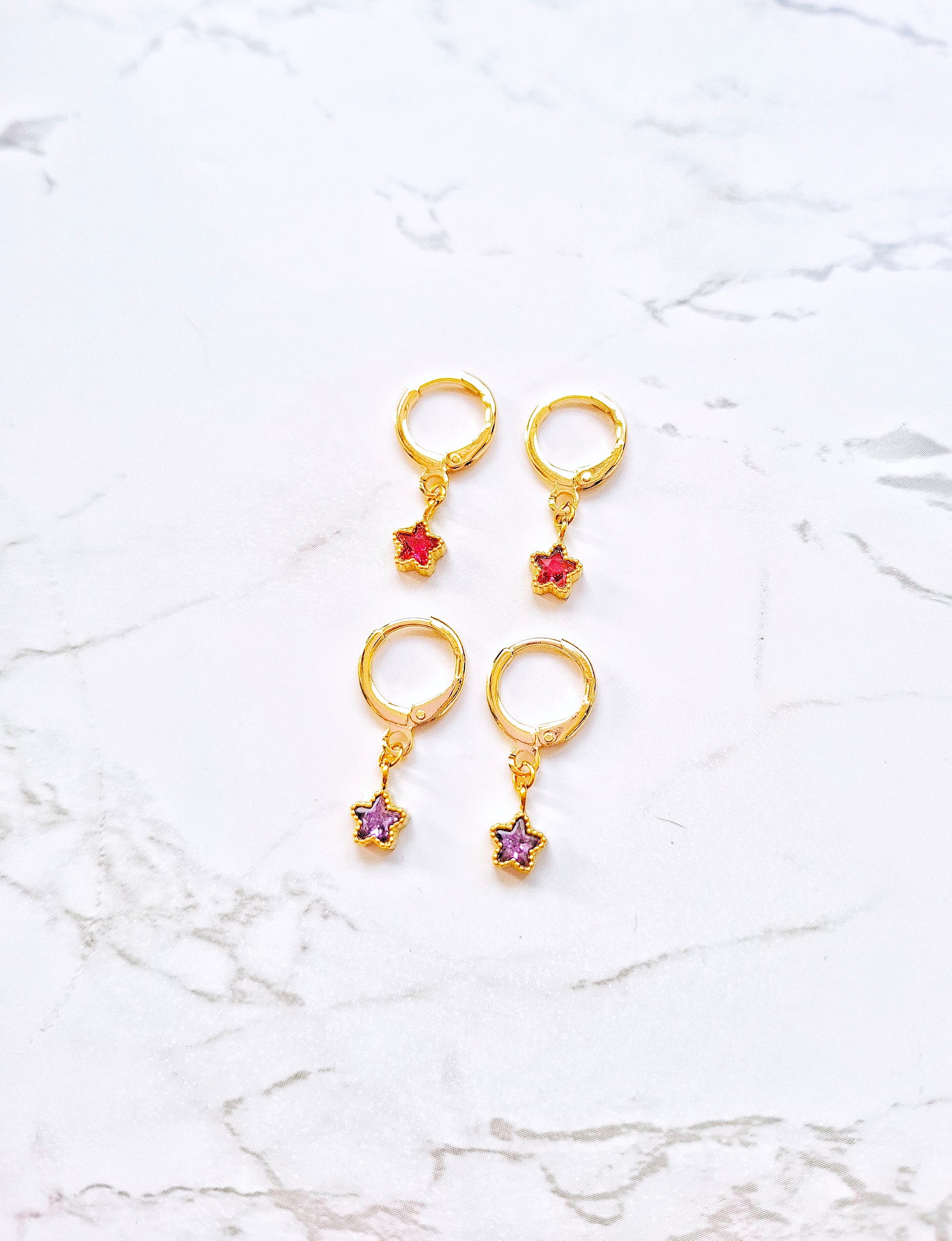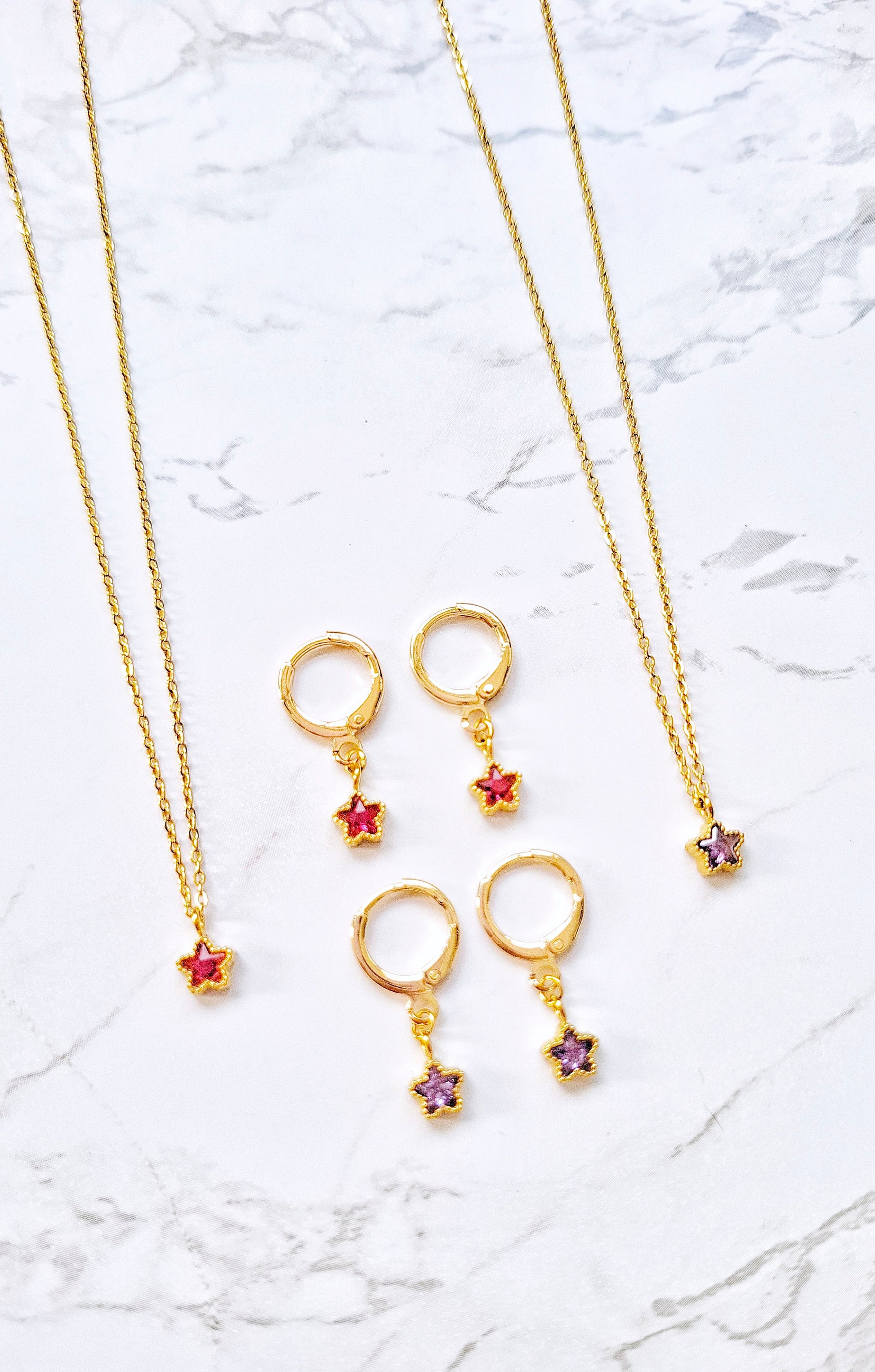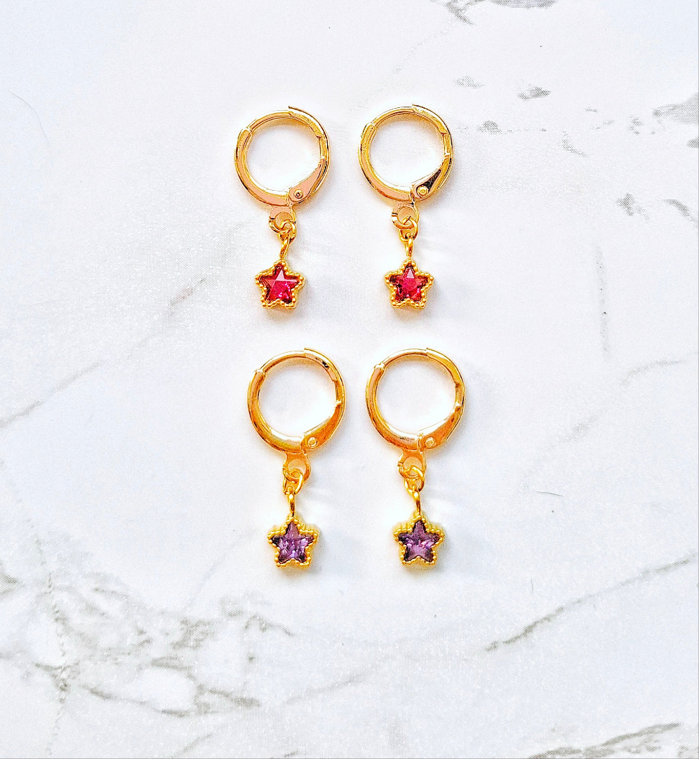 The Star earrings are a pair of tiny star earrings with two kinds of crystals to choose from. We have Amethyst or Pink Tourmaline pendants. It's the ultimate pair to spruce up your outfit or to give as a gift to your gem of a friend!
